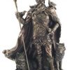 En esta imagen de Resina de 25 cm acabada en Dorado Viejo se le representa con espada, caldero y escudo, atributos de su poder.
