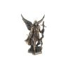En esta imágen de resina de 35 cms acabada en dorado viejo se le representa vestido con armadura y un arco envuelto en llamas.